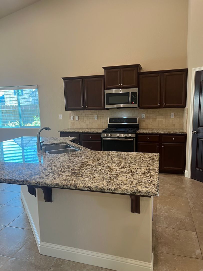 The spacious kitchen features a large island, granite countertops throughout, ample counter space, stainless steel appliances perfect for all your cooking needs.